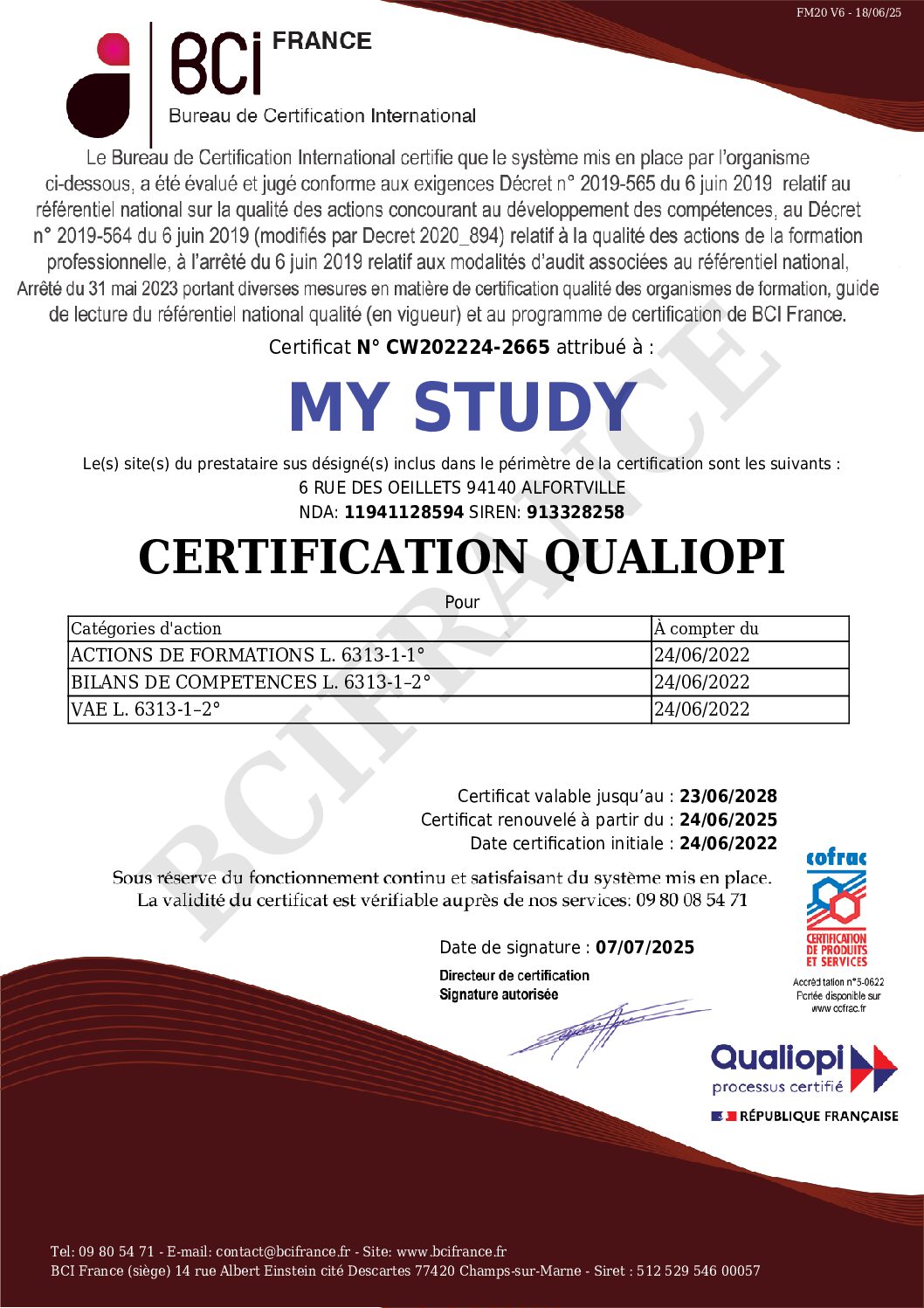 MY STUDY a obtenu en date du 24/06/2022 la certification "Qualiopi", certification des organismes prestataires d'actions concourant au développement des compétences, visés à l'article l. 6351-1 du Code du travail, renouvelée le 24/06/2025